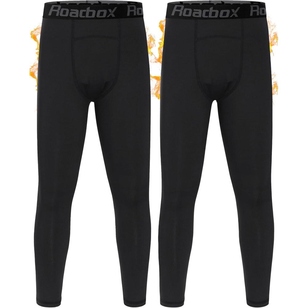 Roadbox Boys Thermal Pants, 2 Pack Kids Fleece Lined Leggings, Youth Sports Baseball Hockey Compression Tights Cold Weather(Black+black)