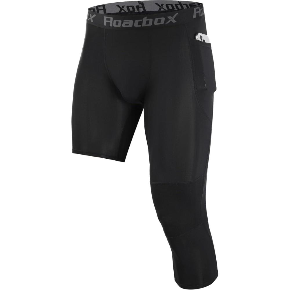 Roadbox Men’s One Leg Compression Pants, 3/4 Single Leg Football Basketball Tights, Sports Athletic Leggings with Pockets(Left Single: 1pack Black)