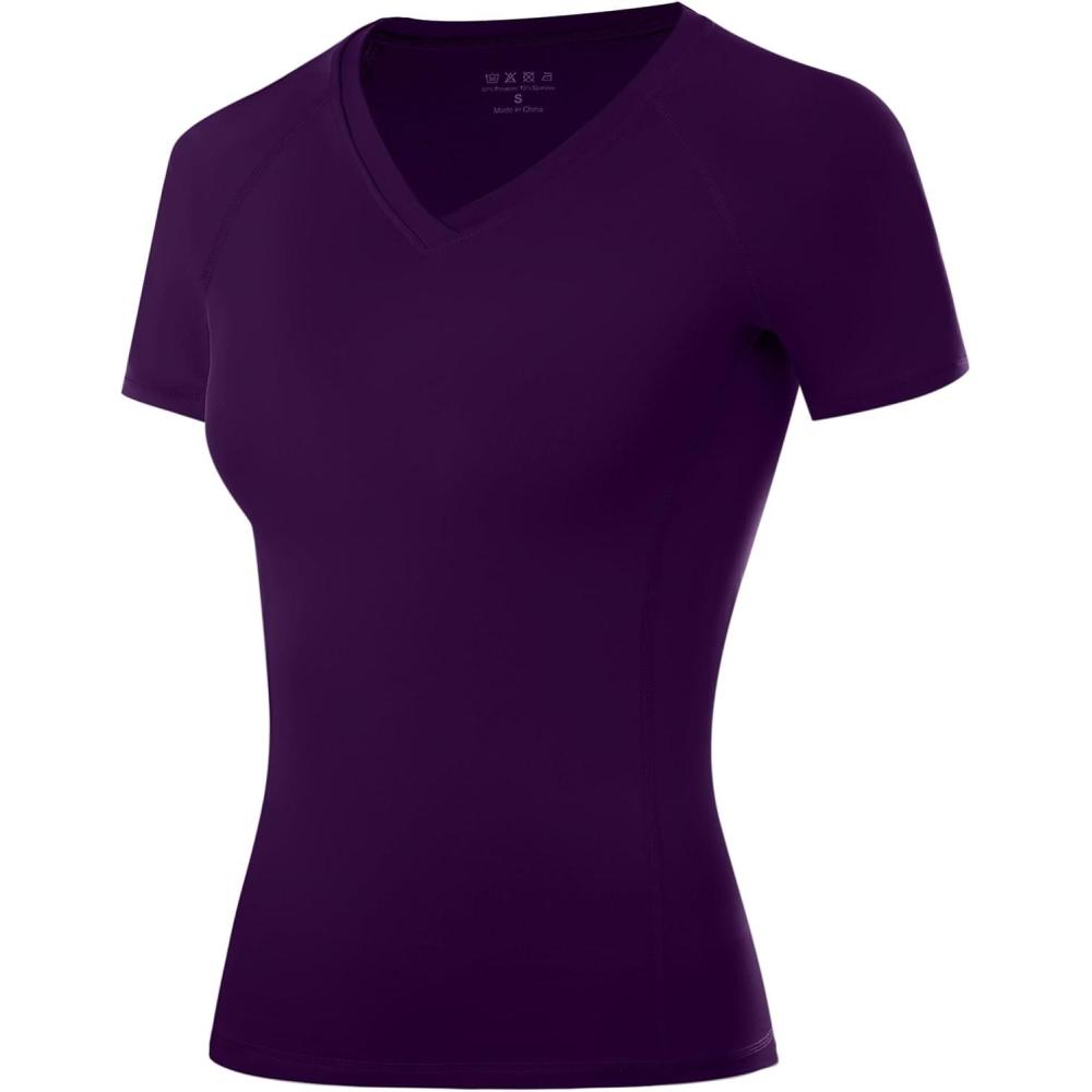 Roadbox Women’s Compression Shirt Short Sleeve V Neck Workout Tops Quick Dry Athletic Gym Base Layer for Yoga Running Sports(Deep Purple)