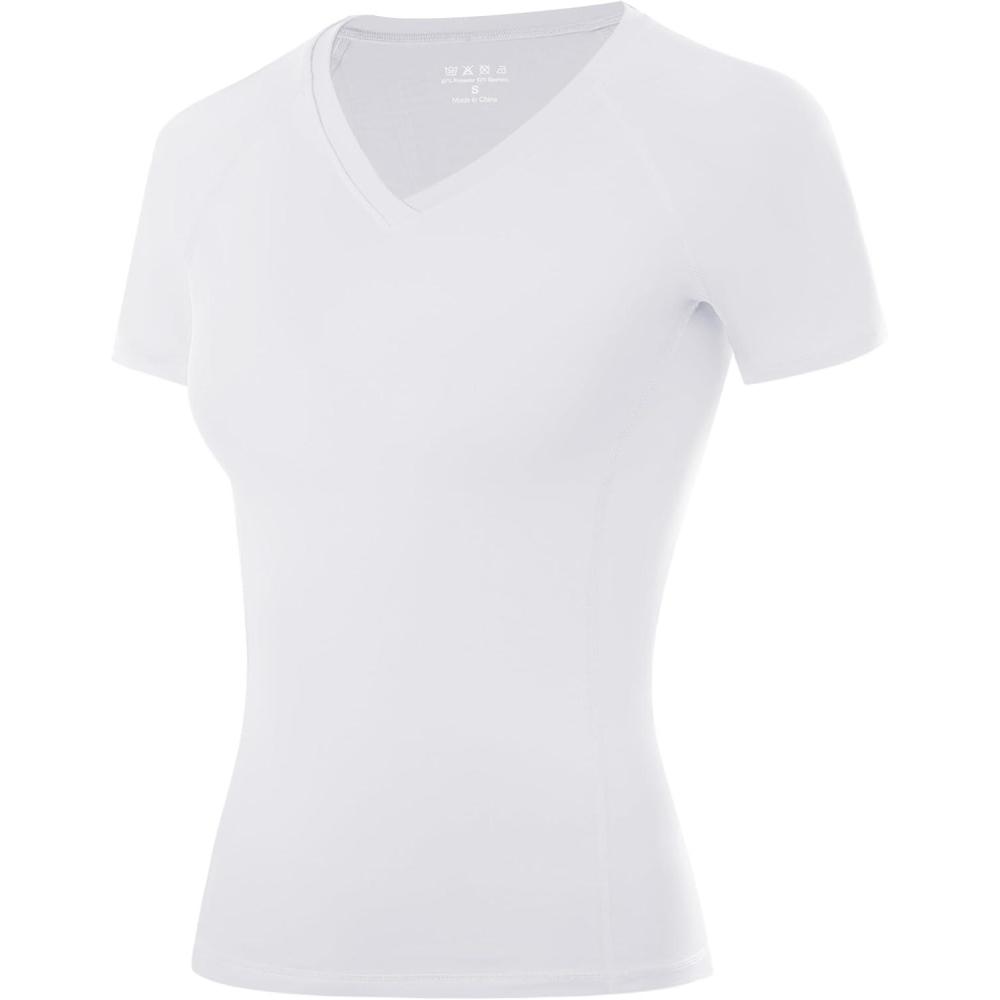 imageRoadbox Womens Compression Shirt Short Sleeve V Neck Workout Tops Quick Dry Athletic Gym Base Layer for Yoga Running SportsWhite